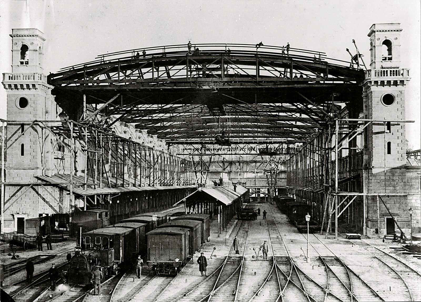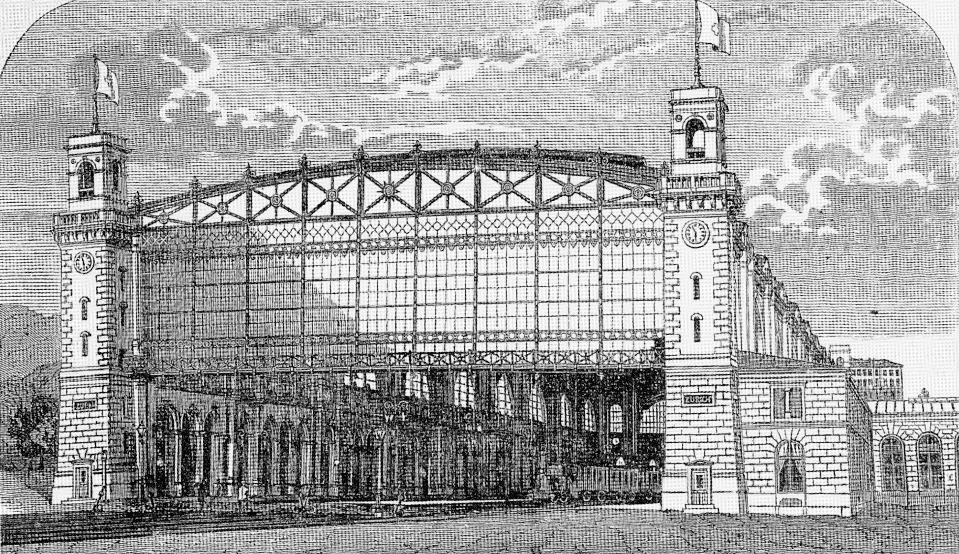 Header Bild: Bereits 1860 beschloss die NOB-Direktion, für den zu klein gewordenen Zürcher Bahnhof von 1847 einen Ideenwettbewerb für eine neue Anlage auszuschreiben. Im Spätherbst 1867 stand das von Architekt Jakob Friedrich Wanner entworfene Projekt mitten im Bau. Die meisten eisernen Dachträger der imposanten Hallenkonstruktion sind montiert, aber immer noch erhebt sich das Relikt aus früheren Zeiten ein hölzerner Perron. Der neue Bahnhof konnte am 15. Oktober 1871 eröffnet werden. (Zentralbibliothek Zürich)