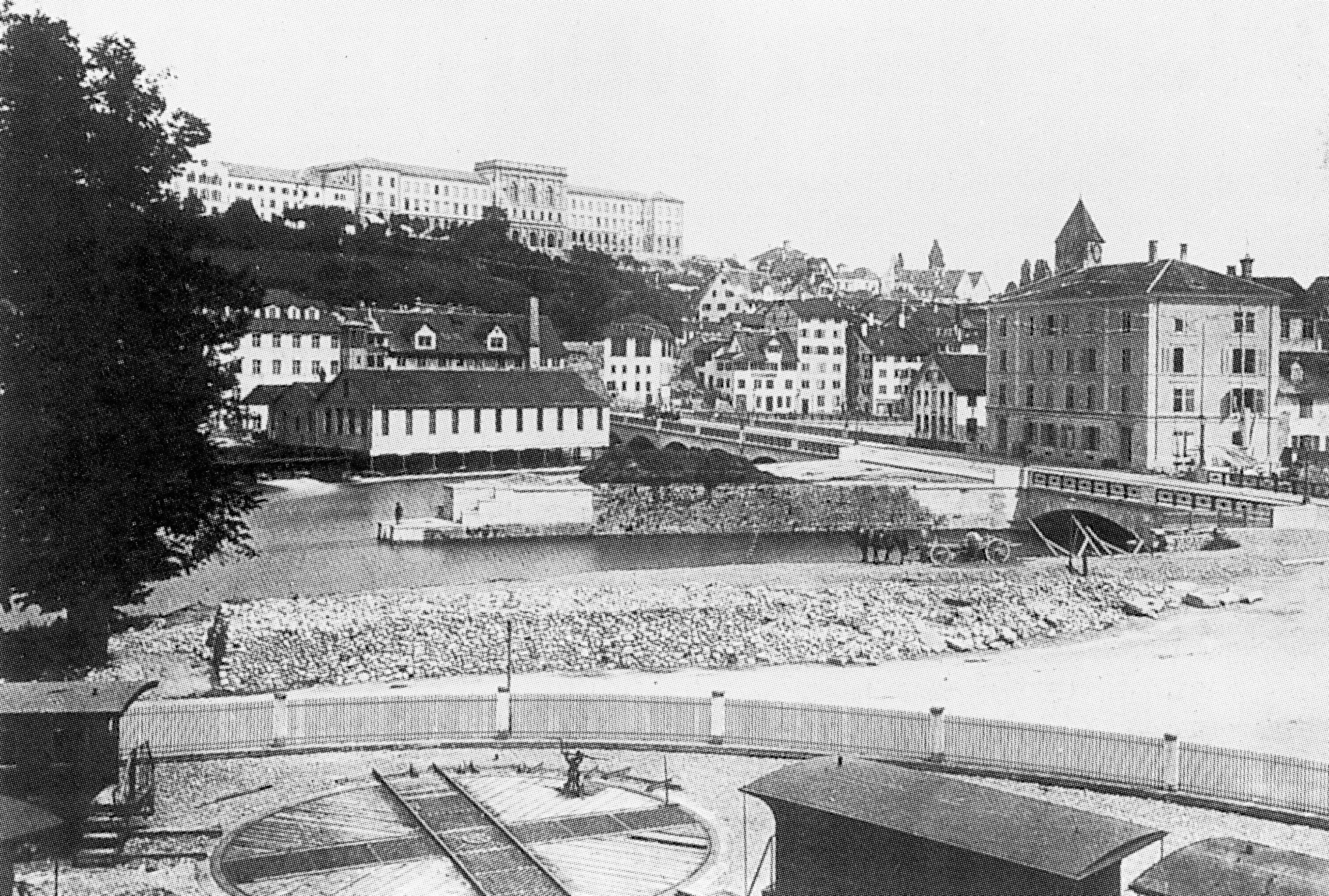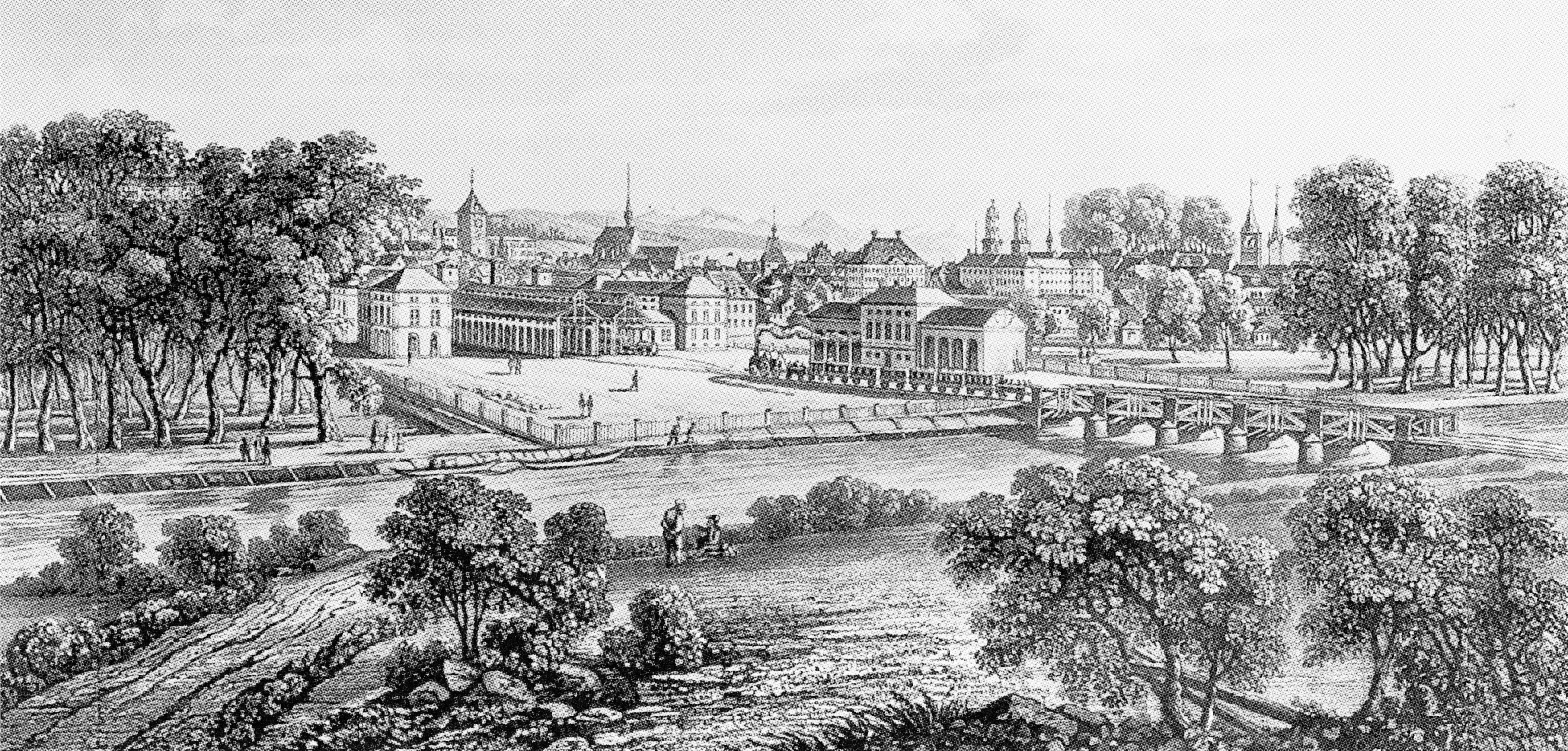 0 Der Zugang zum ersten Bahnhof war keineswegs so komfortabel wie heute: Wie auf der Aquatinta von Johann Baptist Isenring zu sehen ist, hatten die Postkutschen eine enge Brücke über den damals noch hier durchgeleiteten Schanzengraben zu überqueren, während die Fussgänger auf einem hölzernen «langen Steg» über die Limmat dem Bahnhof zustrebten.
