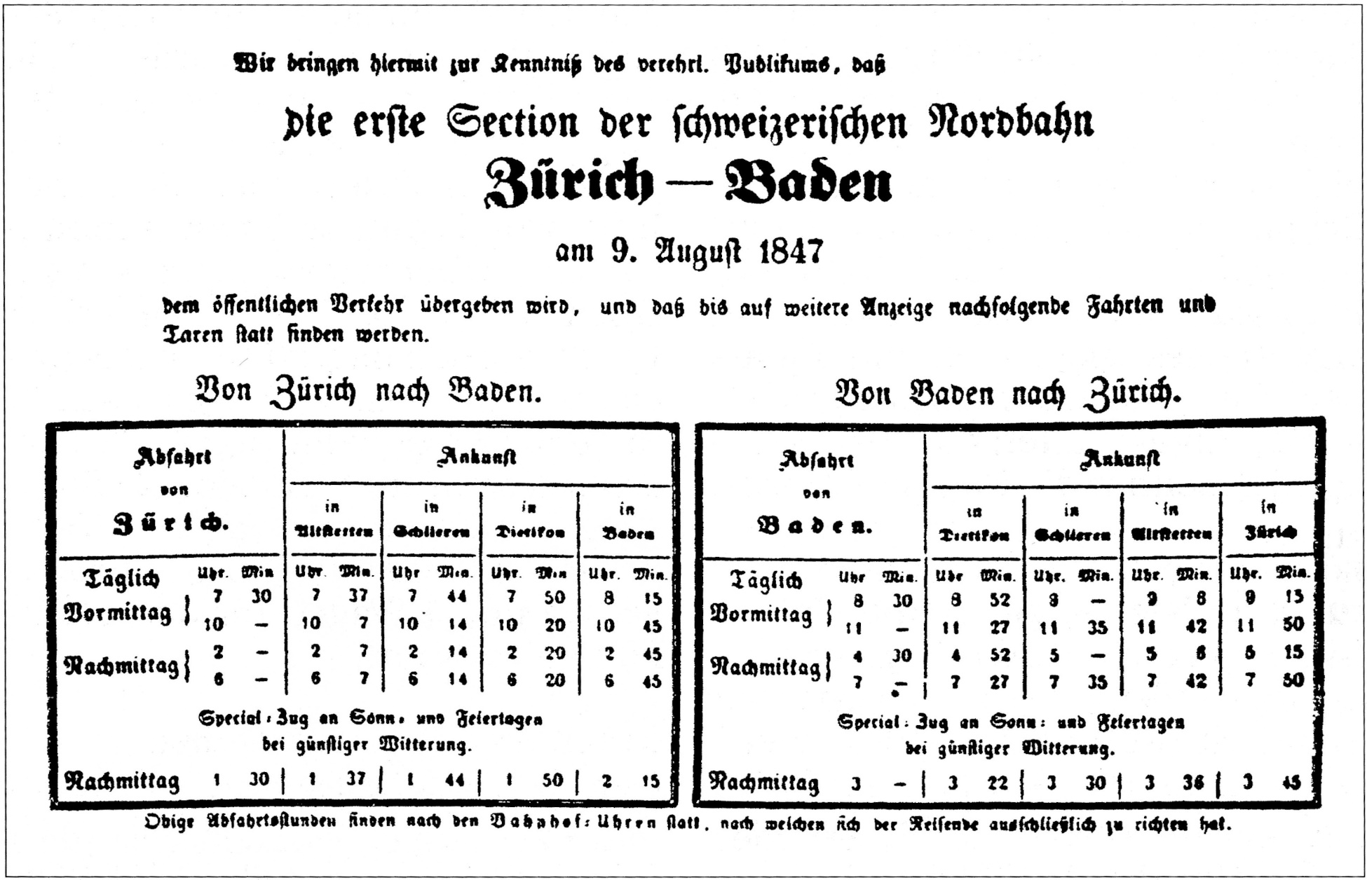 3 Der ab 9. August 1847 geltende Fahrplan der Spanisch-Brötli-Bahn wies vier Züge pro Richtung auf.