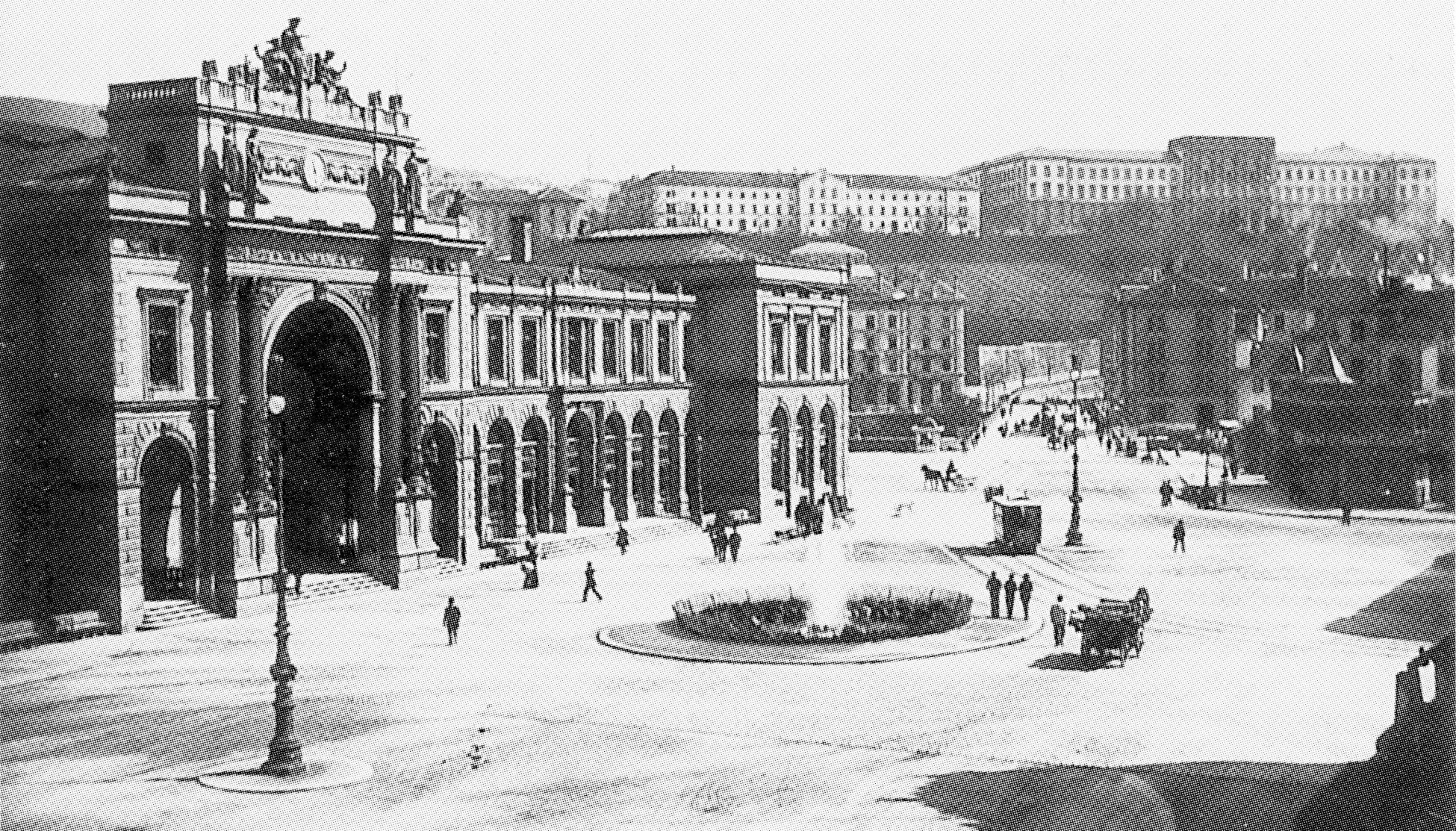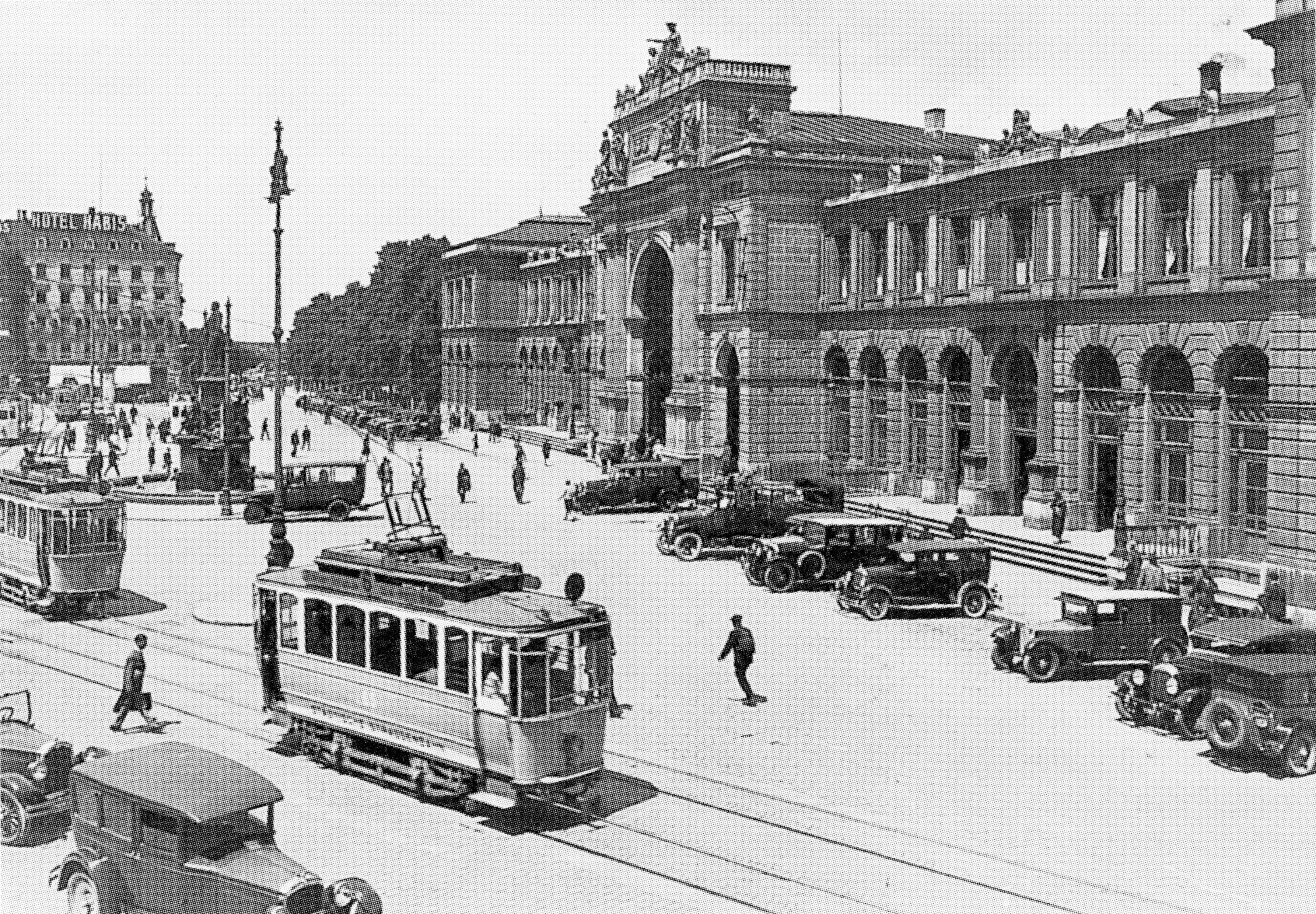 9 Der Bahnhofplatz wird anno 1920 bereits von den elektrischen Trams und den bereitstehenden Mietdroschken in Beschlag genommen. Doch die Fussgänger können den Platz noch nach Lust und Laune überqueren.