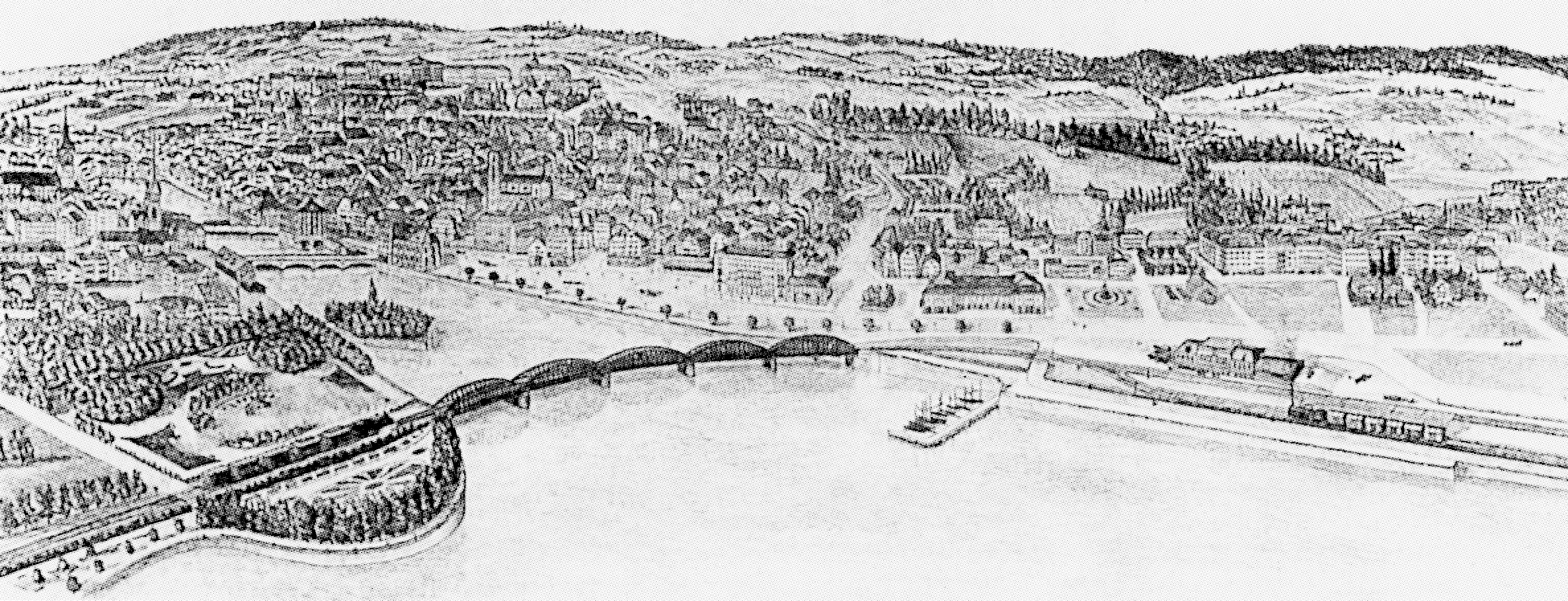 8 Nach den Plänen des Zürcher Kantonsingenieurs Kaspar Wetli aus Männedorf hätte 1871 die rechtsufrige Zürichseelinie einen Bahnhof an der Stelle des heutigen Opernhauses erhalten und wäre dann über eine Limmatbrücke und das Enge-Quartier in den Hauptbahnhof geleitet worden.