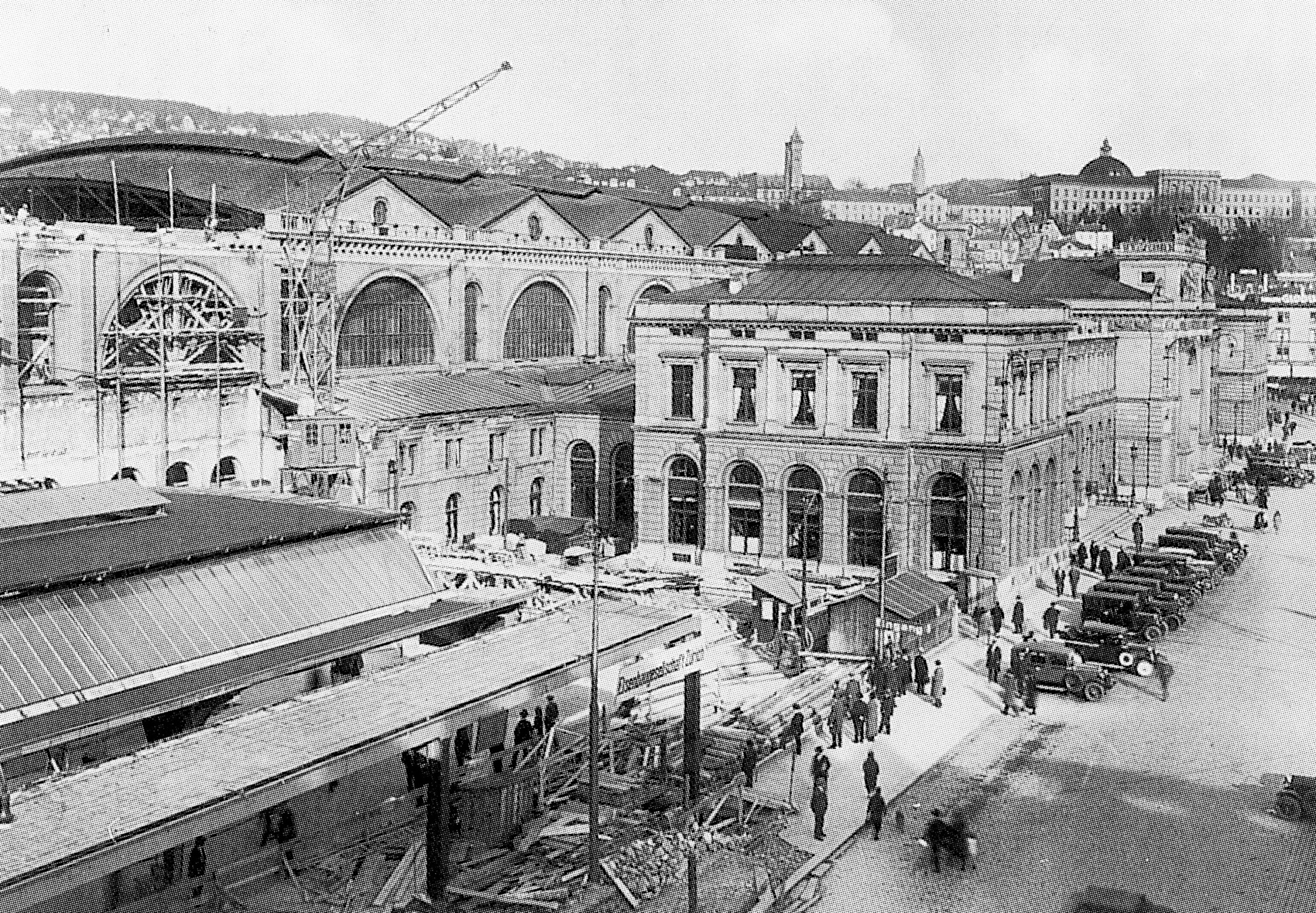 11 Umbauarbeiten am HB um 1930: Zwei der neun Bögen der alten Bahnhofhalle müssen weichen. Das «Pensionierten-Kino» funktionierte bereits, den zahlreiche Schaulustige bevölkerten die Baustelle.