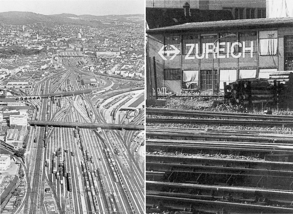 Links: 13 Ruhe vor dem Sturm: Blick auf die Geleiseanlagen das Hauptbahnhofs Zürich vor den Ausbauarbeiten für die S-Bahn. Rechts: 14 «Zureich» statt «Zürich» wurde den eintreffenden Reisenden vom nahen Wohlgrot-Areal her anno 1993 verkündet.